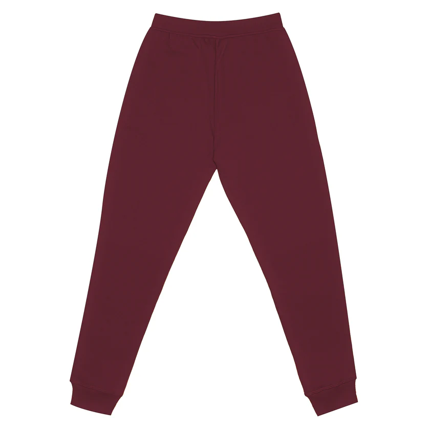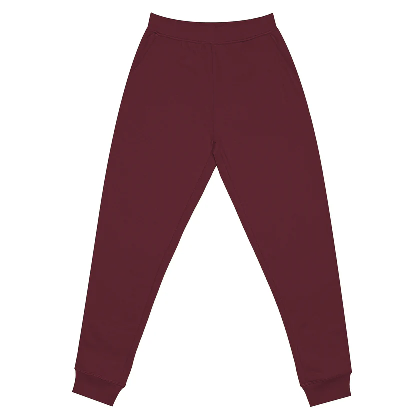 Premium fleece joggers in Maroon. 100% combed ringspun cotton with tapered fit, roomy side pockets, and 2×2 ribbing. Perfect for custom printing and personalization.