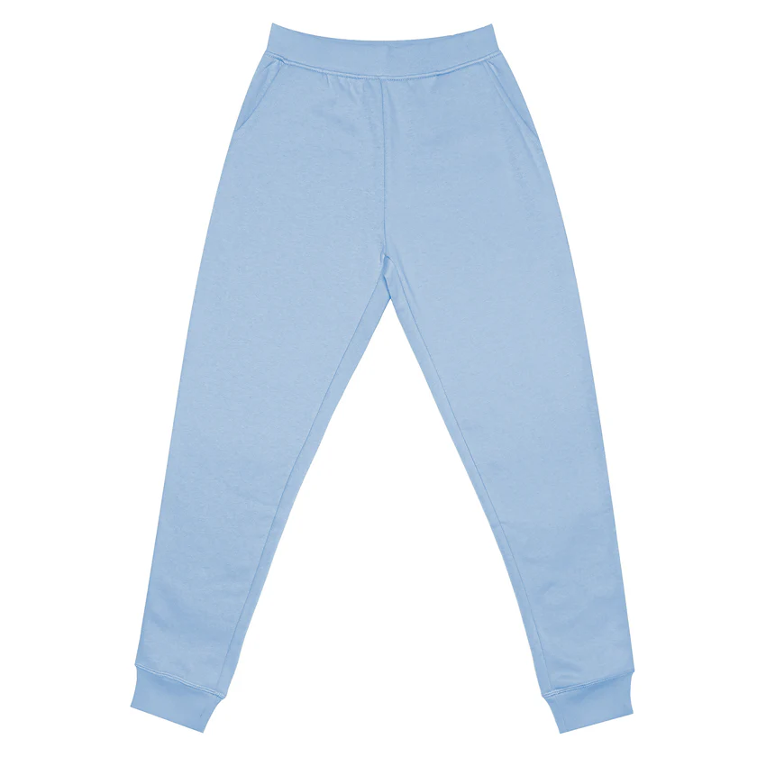 Premium fleece joggers in Sky-Blue. 100% combed ringspun cotton with tapered fit, roomy side pockets, and 2×2 ribbing. Perfect for custom printing and personalization.